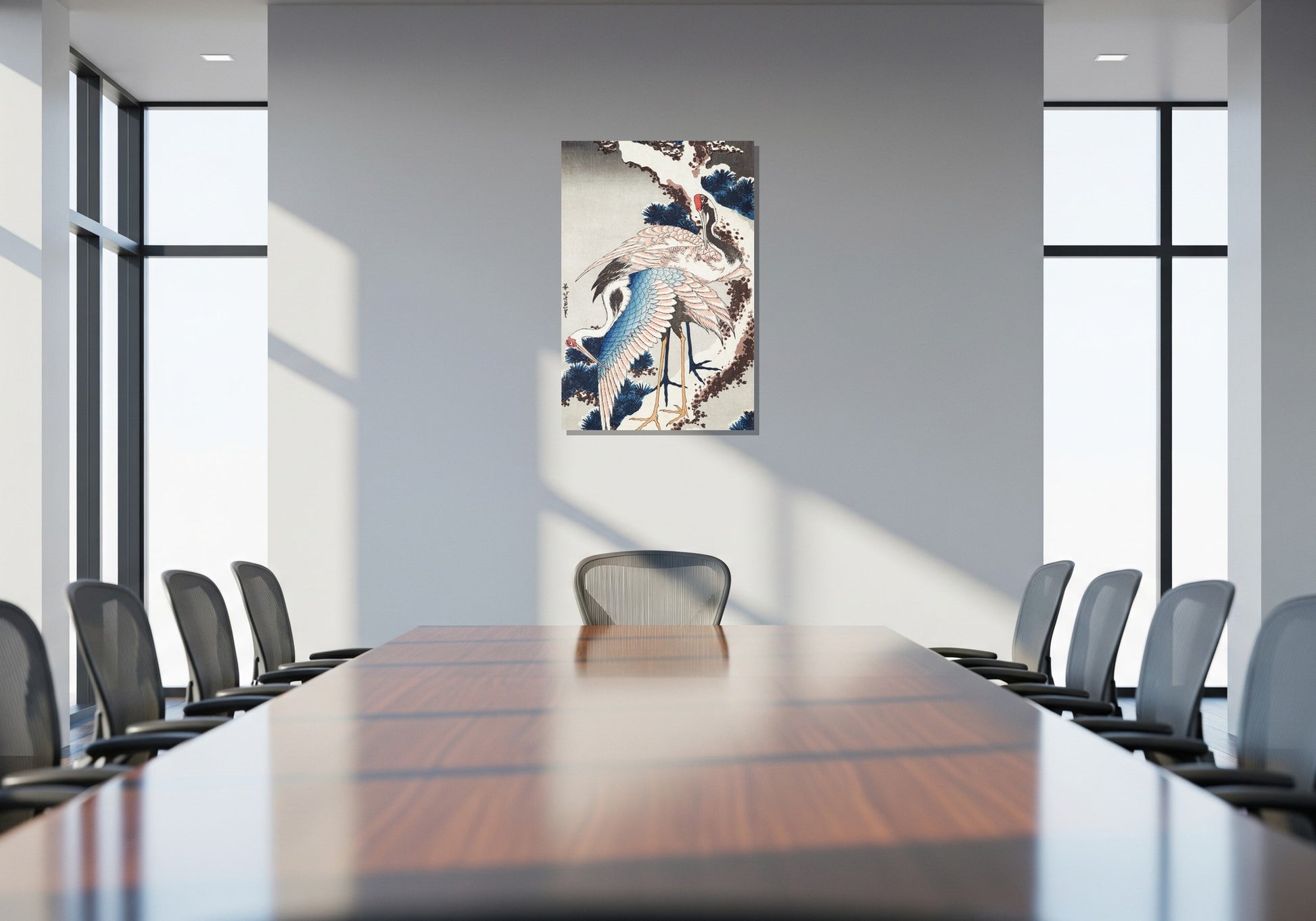 Grullas en una rama de pino cubierta de nieve - Katsushika Hokusai
